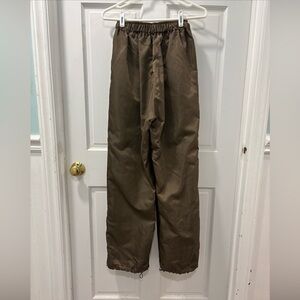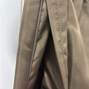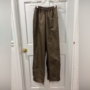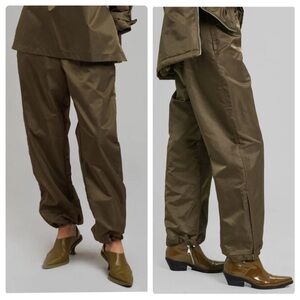 The Frankie Shop Kevin Track Pants, size large in khaki brown. These pants are 100% nylon with elastic waist and drawstring hems with side zippers so they can be worn multiple ways. They have side hand pockets with zippers and the fabric has a sheen to it. They’re in excellent pre owned condition. Avant garde, statement piece.