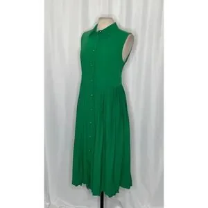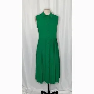Point collar at neckline ~ Sleeveless ~ Defined waistline ~ Skirt has pleats all the way around ~ Button closures all the way down the front ~ Straight hemline ~ Knee length ~ Soft mid-weight non-stretch woven fabric ~ Solid green color