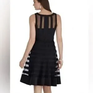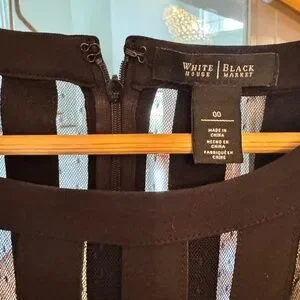Make a statement in this White House Black Market dress, a captivating piece that exudes modern elegance. The fit-and-flare silhouette flatters the figure, while the sheer panels add a touch of allure and sophistication. Horizontal bands create a layered effect, enhancing the dress's visual appeal and creating a dynamic, eye-catching design. The sleeveless design makes it perfect for warmer weather or layering with a jacket or cardigan. This dress is ideal for cocktail parties, date nights, or any special occasion where you want to make a lasting impression.