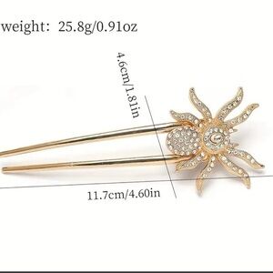 Gold spider hair stick designed to secure styled hair with flair. Sparkling crystal accents add refined shine. Lightweight metal construction for comfortable all-day wear. Ideal for dressing up updos and ponytails. Gold color complements warm-tone outfits.