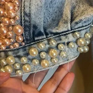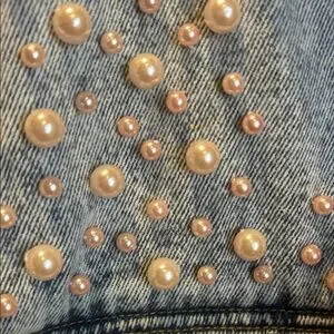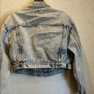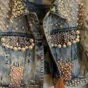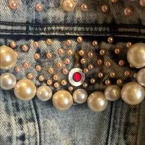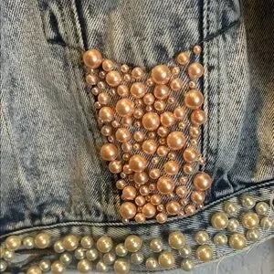 Vintage Contempo Casuals crop embellished denim jacket. Super fun. Missing a few pearls as pictured and a small spot as pictured (hidden by the collar). Extremely unique
