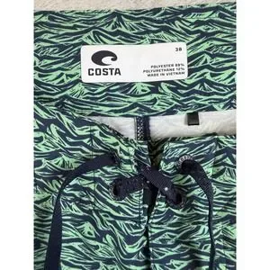 The COSTA Board Shorts in size 38 feature a stylish green wave pattern, making them perfect for performance in water activities like surfing, lifeguarding, and water polo. Made from lightweight polyester fabric, these board shorts offer both comfort and durability. With features like pockets, a drawstring waist, and machine washable care, these Costa Del Mar shorts are ideal for beach days and competitive swim events.