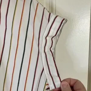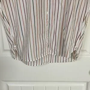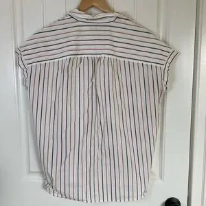 Stylish button-up shirt with multicolor stripes. Features a classic collar and short sleeves. Soft and cool cotton, great for multiple seasons on its own or for layering, spring, summer, beach, feminine take on classic button up style.