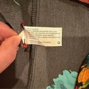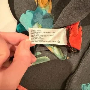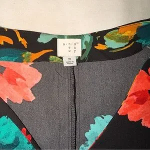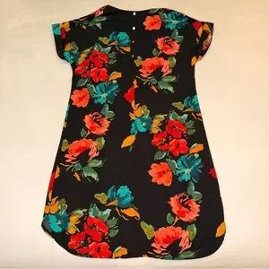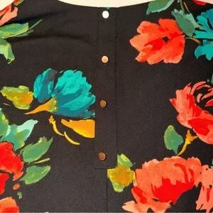 V-neck tunic top with bold floral pattern. Black base with coral, teal, and yellow blooms. Short sleeves and relaxed fit. Versatile, eye-catching everyday piece. No flaws!!