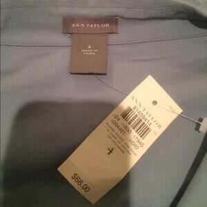 Ann Taylor cross over blouse with side tie. Size 4 in blue. Very cute crossover blouse with a large wrap around tie that can go in to a bow. New with tags. Purchased for $68