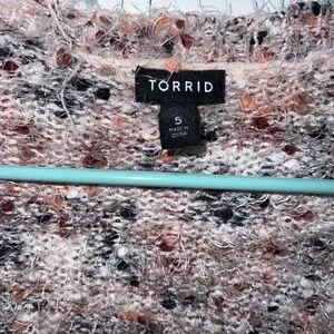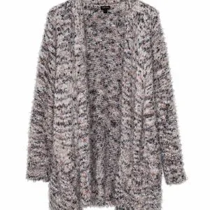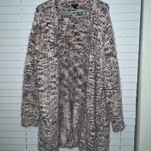 Soft and stylish fuzzy cardigan. Perfect for layering. Features a blend of pink black and gray tones.