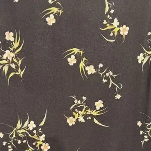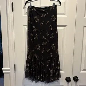 Chic black maxi skirt with delicate floral pattern. Features a stylish ruffled hem.