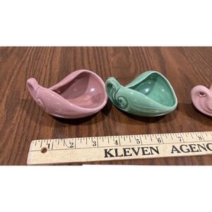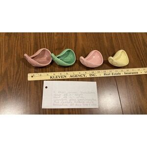 Four small ceramic bowls/dishes about 3 1/2 inches in length in about 2 1/2 inches wide colors are pink yellow green and brown mid century modern style attractive art deco form and color. I have many different items for sale so if interested in multiple items contact me pre-purchase for the shipping cost.