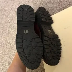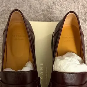 Classic Sezane Albane loafers in rich burgundy leather. Sleek rounded toe and low stacked heel. Clean stitching and subtle shine. Versatile for casual or polished looks.