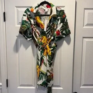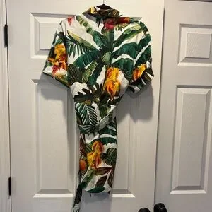 Vibrant tropical print dress. Features lush green leaves and bright yellow and red accents. Short sleeves with a belted waist. Perfect for a summer outing.