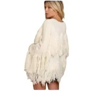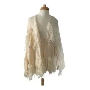 Chic cream cardigan with playful fringe. Ideal for layering. Adds texture and style.