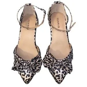 Torrid ankle-strap heels with pointed toe. Bow detail across the vamp. Leopard print pattern on upper. Stiletto heel and secure buckle strap. Stylish for dressy occasions.