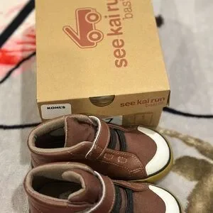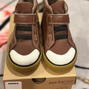 Chic brown sneakers with white toe caps. Black elastic laces for easy fit. Ideal for active kids.