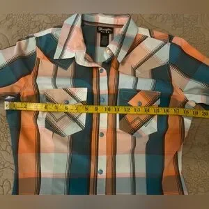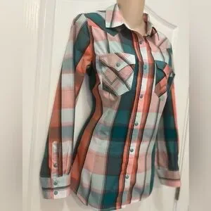 Uniquely colored plaid pearl snap shirt from Wrangler Retro for Women. The teal and pale orange are sure to make you a stand out, but it’s the pearls snaps designed to look like turquoise stones that are really the showstopper! Arena fit seaming for a tailored look. Like new condition.