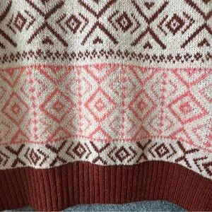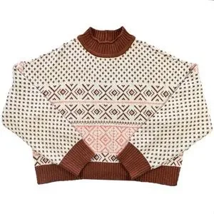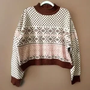 American Eagle cropped knit sweater featuring a classic Fair Isle pattern in warm neutral tones with a hint of peachy pink. Cozy textured knit with a ribbed mock neck, cuffs, and hem for a structured yet relaxed fit. Easy cold-weather piece perfect for pairing with denim, corduroy, or leggings.