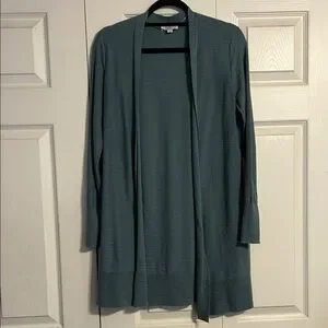 Size x-small Ann Taylor Loft teal / sea foam green open long length cardigan. This 100% cotton cardigan has slits in sides and is a great layering piece.