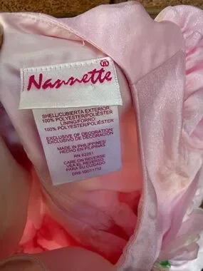Delicate light pink satin with floral accents. Sheer overlay and soft sheen. Sweet ribbon and pleated details. Perfect for special occasions.