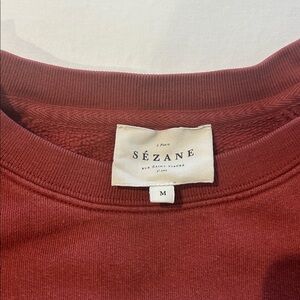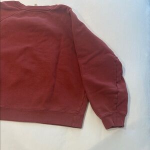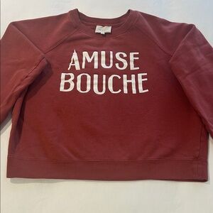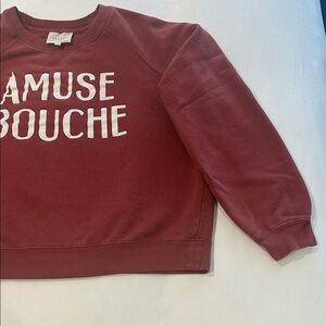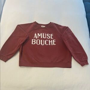 Described by brand as faded red/ecru. Organic cotton sweatshirt with long sleeves. “Amuse Bouche” printed on front. Rounded neckline.