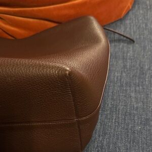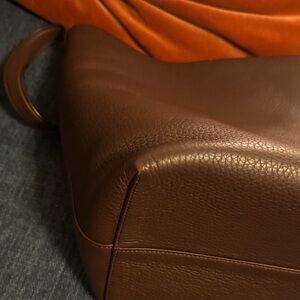 Stylish brown leather bucket bag with a sleek design. Perfect for everyday use. Comes with zoomoni organizer