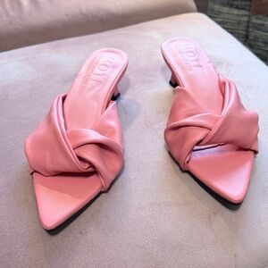 MOTF pink mules with a twisted knot leather upper. Pointed toe and low kitten heel. Padded insole for comfort. Sleek, modern silhouette for day or night.