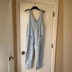Chic light blue denim overalls. Relaxed fit with front pockets. Perfect for casual wear.