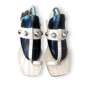 Elevate your footwear game with these Vince Camuto sandals. The beige animal print leather upper features studded accents and a logo. The slip-on style has an adjustable ankle strap and buckle closure for a comfortable fit. The flat rubber outsole ensures stability while the leather insole adds comfort. These sandals are perfect for travel, parties, or casual wear during spring, summer, and fall.