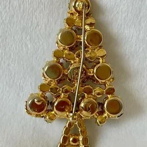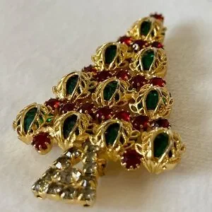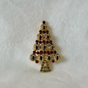 This beautiful vintage Hobe Christmas tree brooch has a gold tone setting, red rhinestones on top and in between filigree covered green rhinestones, and light gray rhinestones on the trunk. All rhinestones are prong set, in great condition.
