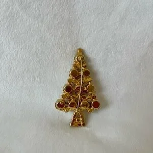 Elegant sparkling Christmas tree brooch with sparkling red, green and gold details. Perfect for holiday gifting and outfits.