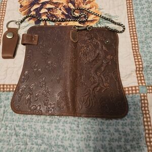 Stylish brown leather wallet featuring an embossed dragon design. Comes with a matching chain for added security.