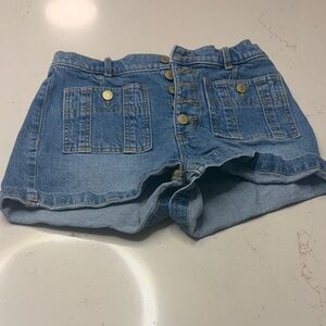 Chic blue jean shorts with front button detail. Features dual front pockets. Ideal for casual wear.