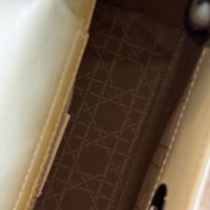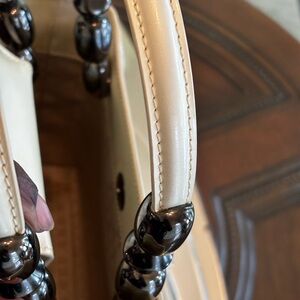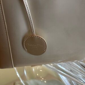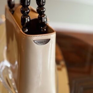 Chic Christian Dior tan patent shoulder bag with striking glossy black beaded handles. Smooth, structured silhouette for a refined everyday look. Easy-to-wear design that complements neutral and bold outfits. Polished finish adds a modern, upscale touch. Tiny callout on one side as shown in the photo.