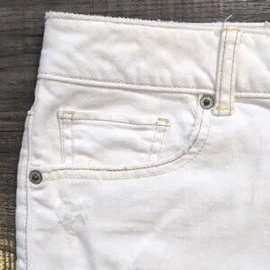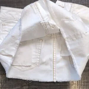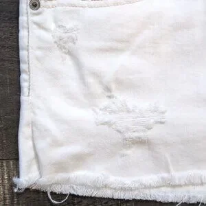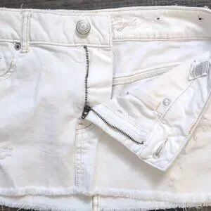 Stylish white mini skirt with distressed details. Features a frayed hem and classic five-pocket design. Stretch denim material with contrast stitching.