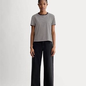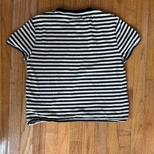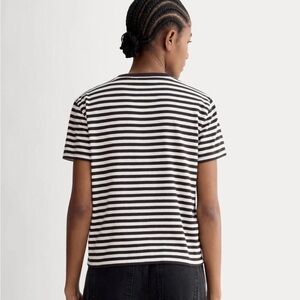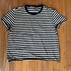 Classic black and white striped crewneck tee. Soft, breathable fabric for everyday comfort. Short sleeves and a relaxed fit for easy layering. Versatile black and white colorway for timeless styling.
