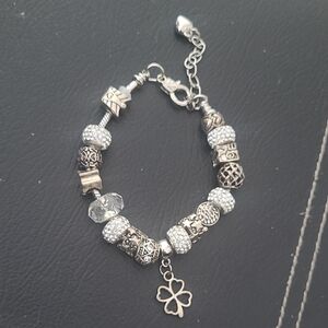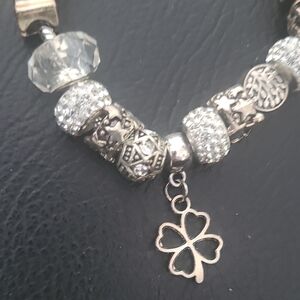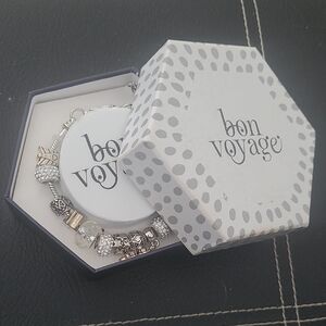 Pandora inspired, Bon Voyage silver-tone charm bracelet with assorted decorative charms. Stylish multi-charm design for everyday wear. Lightweight and versatile accessory in silver color. Makes a great gift.