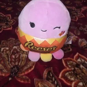 Squishmallows x Reese's octopus plush. Pink top with orange Reese's band. Winking embroidered face and small heart detail. Soft, candy-themed collectible plush.