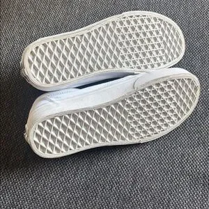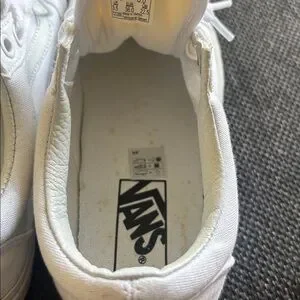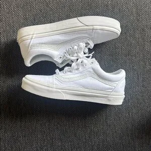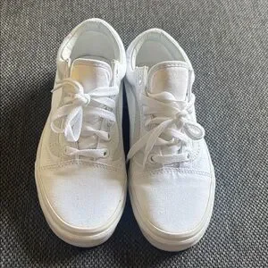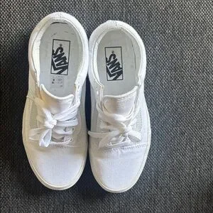 White canvas low-top sneakers by Vans. Lace-up style with classic logo on heel. Minimal, casual design for everyday wear.