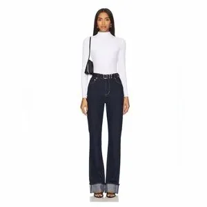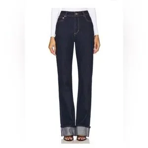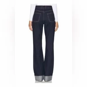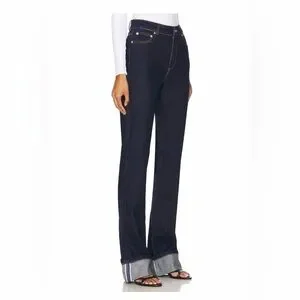 High-rise straight-leg jeans in deep indigo. Minimal stitching and classic five-pocket styling. Rolled cuffs show selvedge detail. Versatile pair for casual or dressed-up looks. Never been worn…brand new!