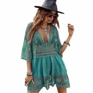 Lightweight lace swim cover-up with intricate embroidered details. Breathable, sheer fabric for easy layering over swimwear. Flowy silhouette with a V-neck to create a relaxed, stylish look. Perfect for poolside or beach days.