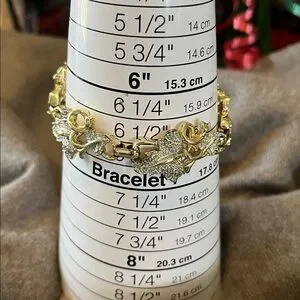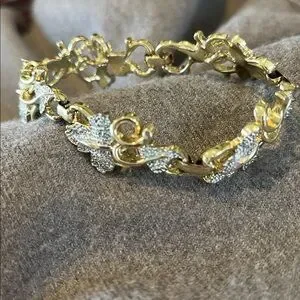 Sarah Coventry Two-toned Leaf Bracelet. Beautiful faux pave look silvertone leaves with yellow goldtone vine design. Foldover clasp. Measures 6.5” on bracelet cone. Good condition-minimal wear. Smoke free & pet free home.