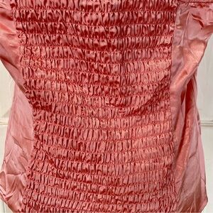 Chic pink blouse with a glossy finish. Features a button-up style and short sleeves. Ideal for a polished look. This is in excellent condition with no flaws. The approximate flat lay measurements are;