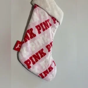 Add some holiday cheer with this Victoria’s Secret PINK Christmas Stocking. Featuring a repeating red “PINK” logo pattern on a pink and white background, this festive stocking has a plush white cuff and a red ribbon hanger for easy display. Made from soft cotton and generously sized, it’s perfect for holiday décor or gifting.
