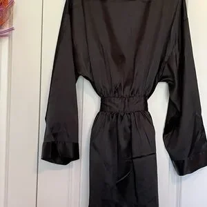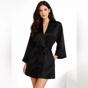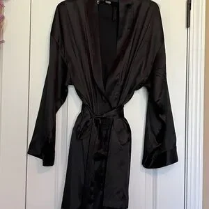 Beautiful Victoria’s Secret black satin robe with a smooth, silky feel and elegant drape. This classic wrap robe features a matching tie waist belt and relaxed sleeves for a comfortable, flattering fit.