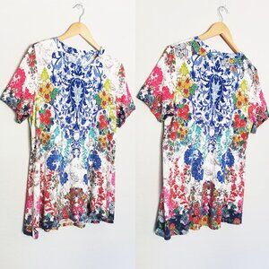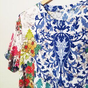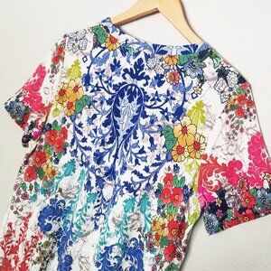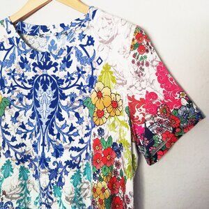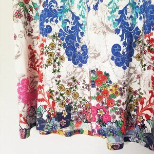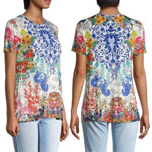 The stunning print of this crew neck tee turns a simple piece into a fashion must-have. The vibrant and colorful floral print also features some paisley-inspired elements for a boho-chic feel. This versatile piece is a great addition to a casual look with leggings but will also work as a colorful layer underneath a structured jacket.