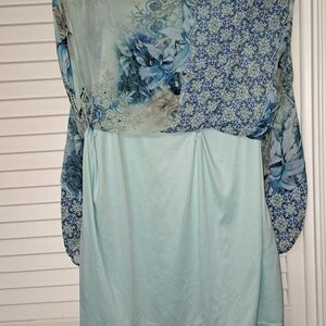 Elegant blouse with floral and geometric designs. Features teal and blue shades. Perfect for stylish outings. Lightweight and Breathable! The arms are see-through. The front and back have a silk light blue lining underneath.