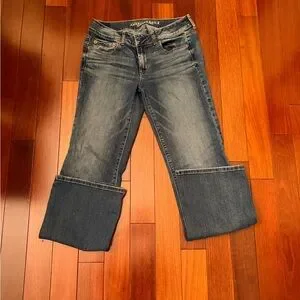Stylish flare jeans by American Eagle Outfitters. Comfortable fit with a trendy wide leg design. Perfect for casual outings.