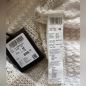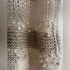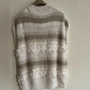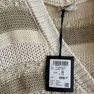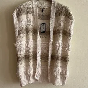 NWT $ 659.00 Made in Italy. Elegant striped cardigan - vest with a soft texture. Color: gold, white, beige and gold sequins. Italy size : IT 48 , US 12 . Measurements approximately: length 26” , underarm 20” .Perfect for layering. Features a stylish open front , four snap.