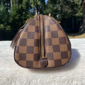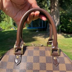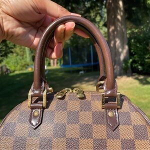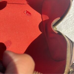 Canvas is vibrant and nice. It has minor rubs, scratches,handle is retouched/recolored by the first owner no cracks. Inside has some stains. Metal hardware has some tarnish.You can put strap to make it a crossbody, hard to find. Still in good used condition.