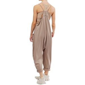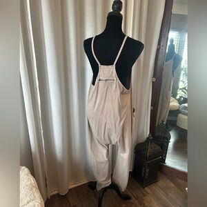 Light beige women's jumpsuit. Effortless, oversize,slouchy fit meant for layering. Roomy pockets & dropped armholes. Soft, lightweight 95% cotton 5% Spandex fabric for all-day comfort. Versatile neutral piece that pairs easily with layers and accessories.