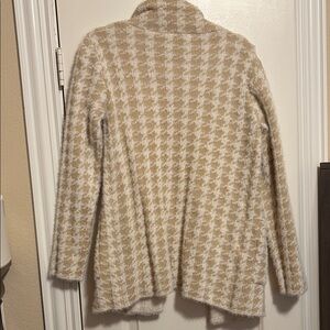 Stylish houndstooth pattern. Open front with single button closure. Cozy and chic design.