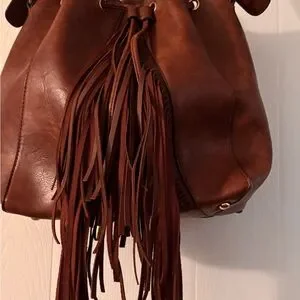Elevate your style with this elegant faux brown leather shoulder bag featuring chic fringe details. Perfect for a sophisticated, bohemian look. Bucket Bag.